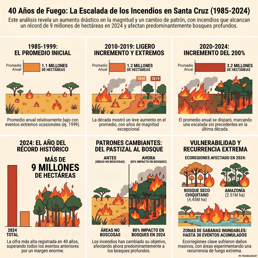 Se presenta la reciente publicación en la revista Ecología en Bolivia, en la cual se analizan de manera integral las tendencias y patrones de los incendios forestales en el departamento de Santa Cruz durante el periodo 1985–2024. Este trabajo constituye un aporte técnico relevante para la comprensión de la dinámica espacial y temporal del fuego, así como de sus implicaciones sobre los distintos ecosistemas del territorio.