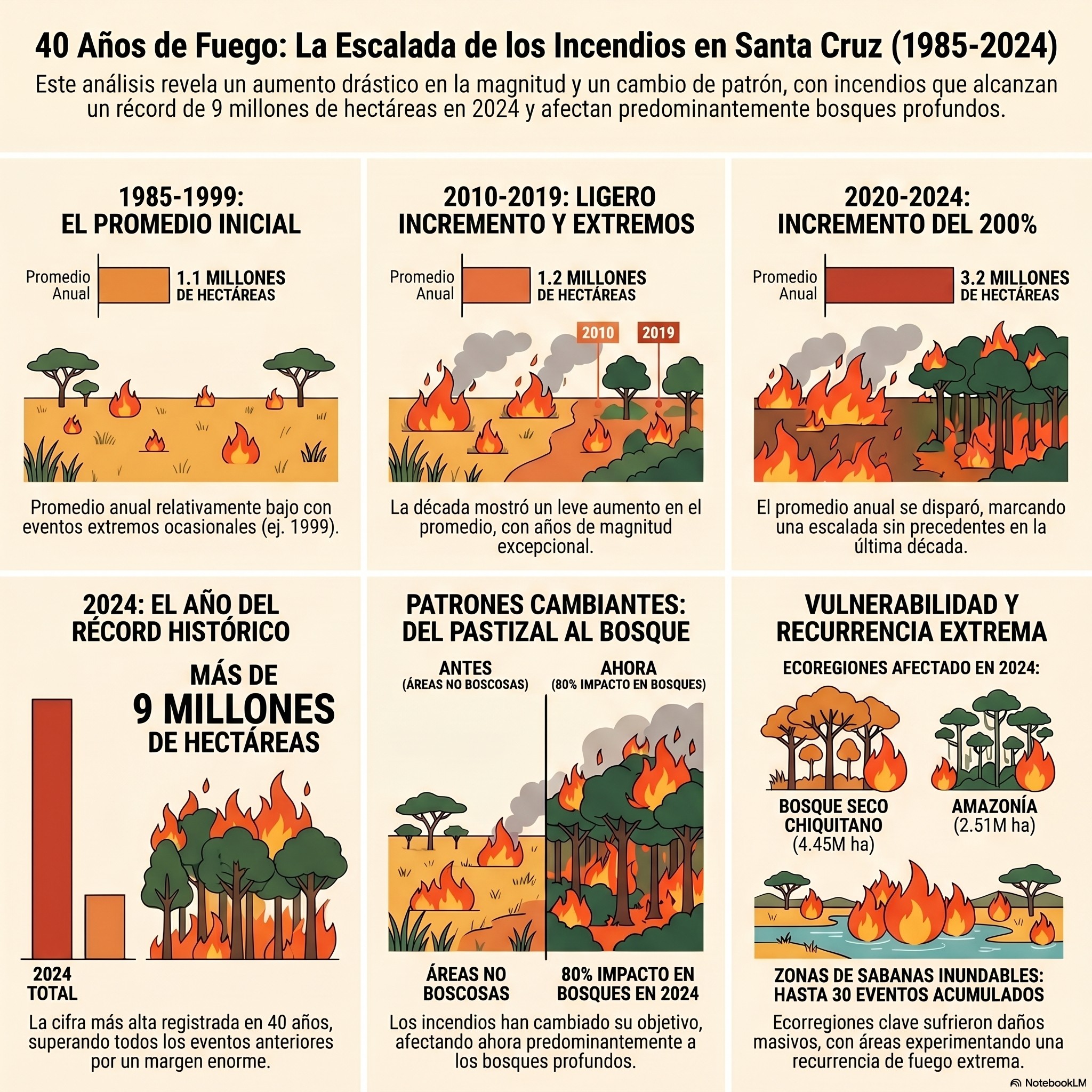 Entre 1985 y 2024, la superficie afectada por incendios forestales en el departamento de Santa Cruz evidencia una tendencia creciente y una intensificación sostenida, con un promedio anual de 1.55 millones de hectáreas quemadas. Este comportamiento no ha sido uniforme, sino que ha estado marcado por fluctuaciones interanuales y eventos extremos que reflejan cambios estructurales en la dinámica del fuego. A nivel decadal, se observa una fase inicial de expansión entre 1985 y 1999 con aproximadamente 1.1 millones de hectáreas afectadas por año, seguida de un incremento en el periodo 2000-2009 hasta 1.6 millones de hectáreas. Posteriormente, entre 2010 y 2019 se registró una ligera reducción a 1.2 millones de hectáreas anuales, sugiriendo una relativa estabilidad. Sin embargo, el periodo más reciente, 2020-2024, muestra un cambio drástico, duplicando las cifras previas y alcanzando un promedio de 3.2 millones de hectáreas anuales, con eventos extremos en años como 1999, 2004, 2010, 2019 y un máximo histórico en 2024, cuando se superaron los 9 millones de hectáreas quemadas.